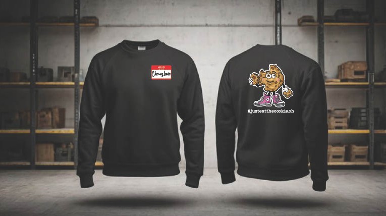 “Hello, my name is Chewy Louie” shows on the left crest while Chewy Louie looks on in a full-sized design on the back, all on a black crewneck sweatshirt! Available in Adult Sizes XS – 3XL.