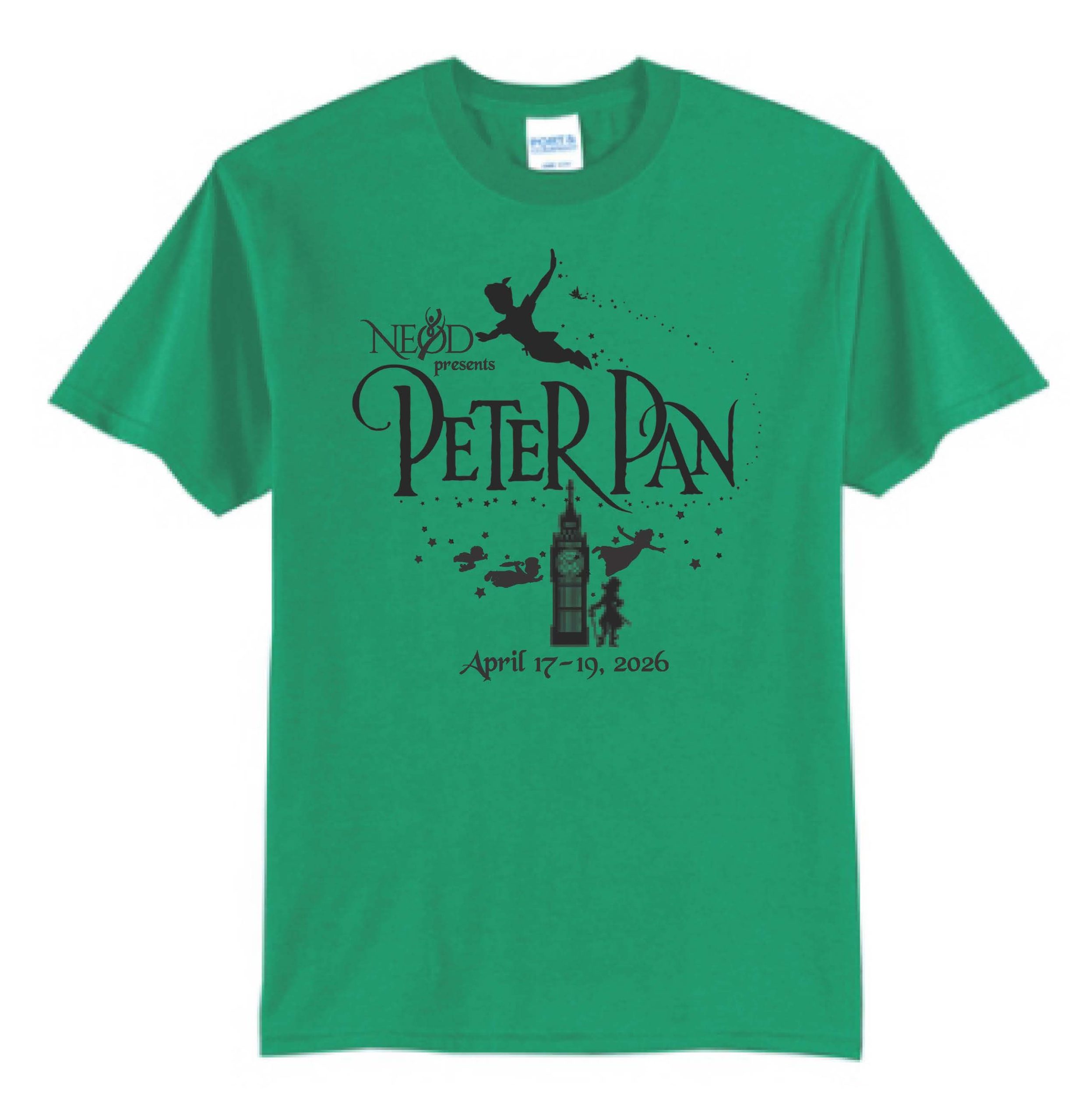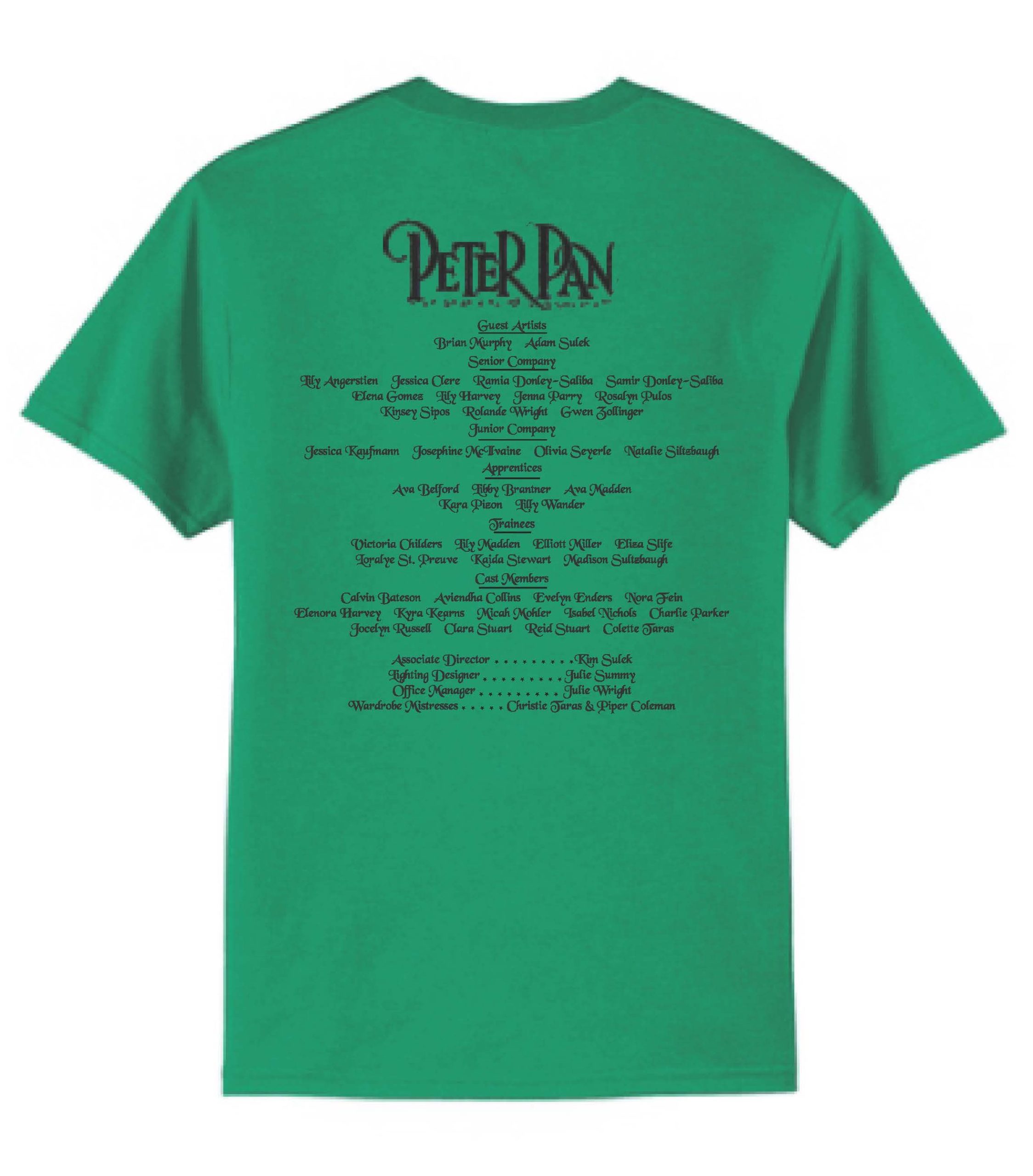 These kelly green t’s are decorated with the Peter Pan logo in a full front design and cast/crew proudly displayed on the back.