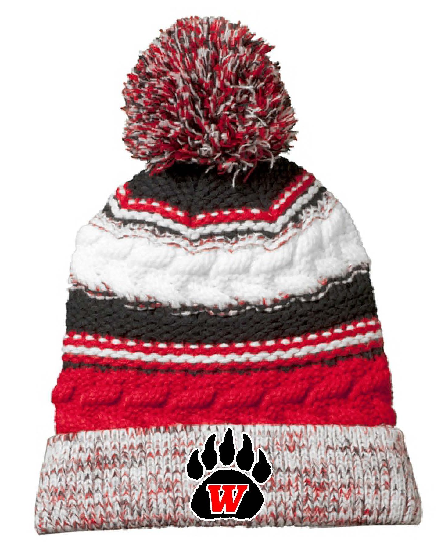 This true red, black, and white pom pom beanie is embroidered with the Wadsworth paw print.