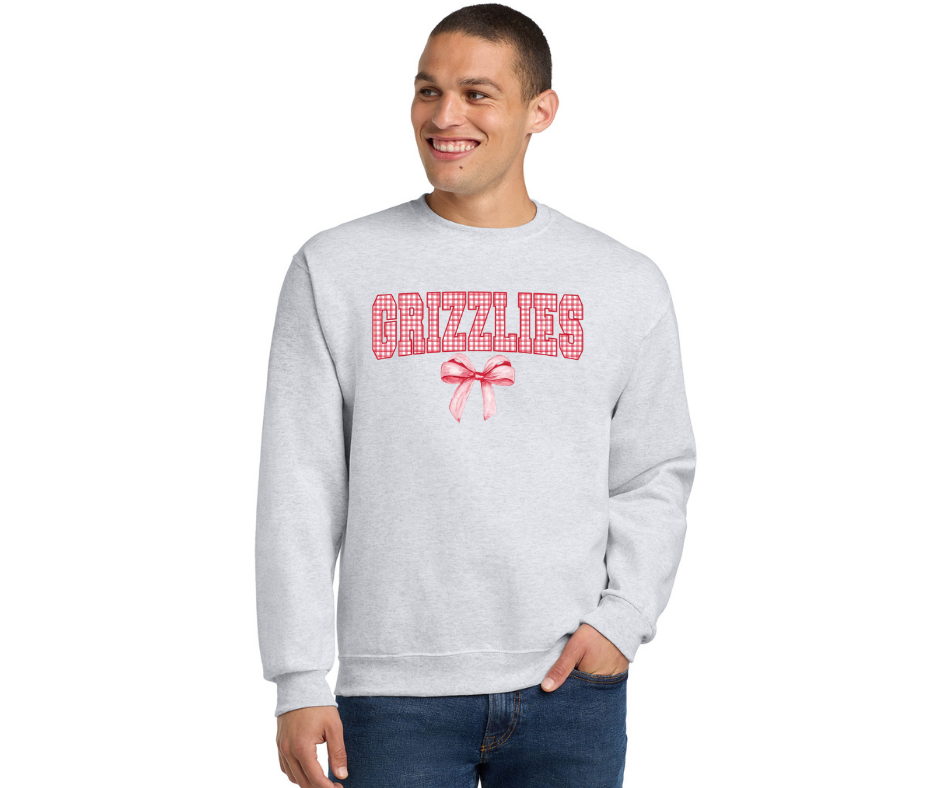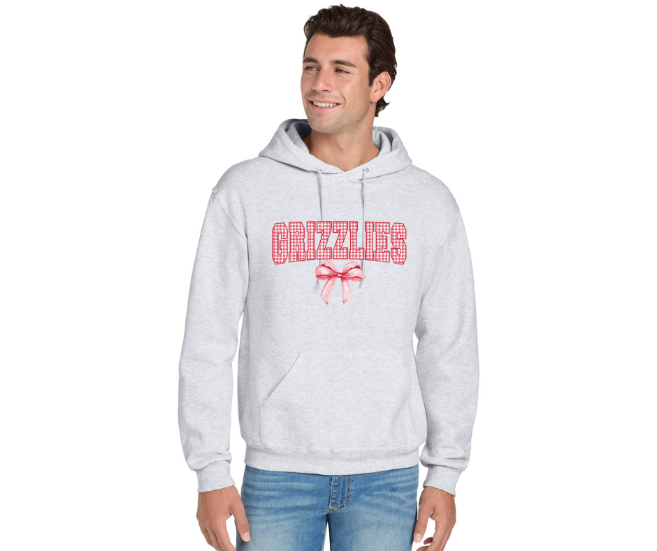 This cute gingham plaid with a red bow is a great way to show your Grizzly pride! Choose from a t-shirt, long-sleeve t-shirt, crewneck sweatshirt, or hoodie on a light grey background.