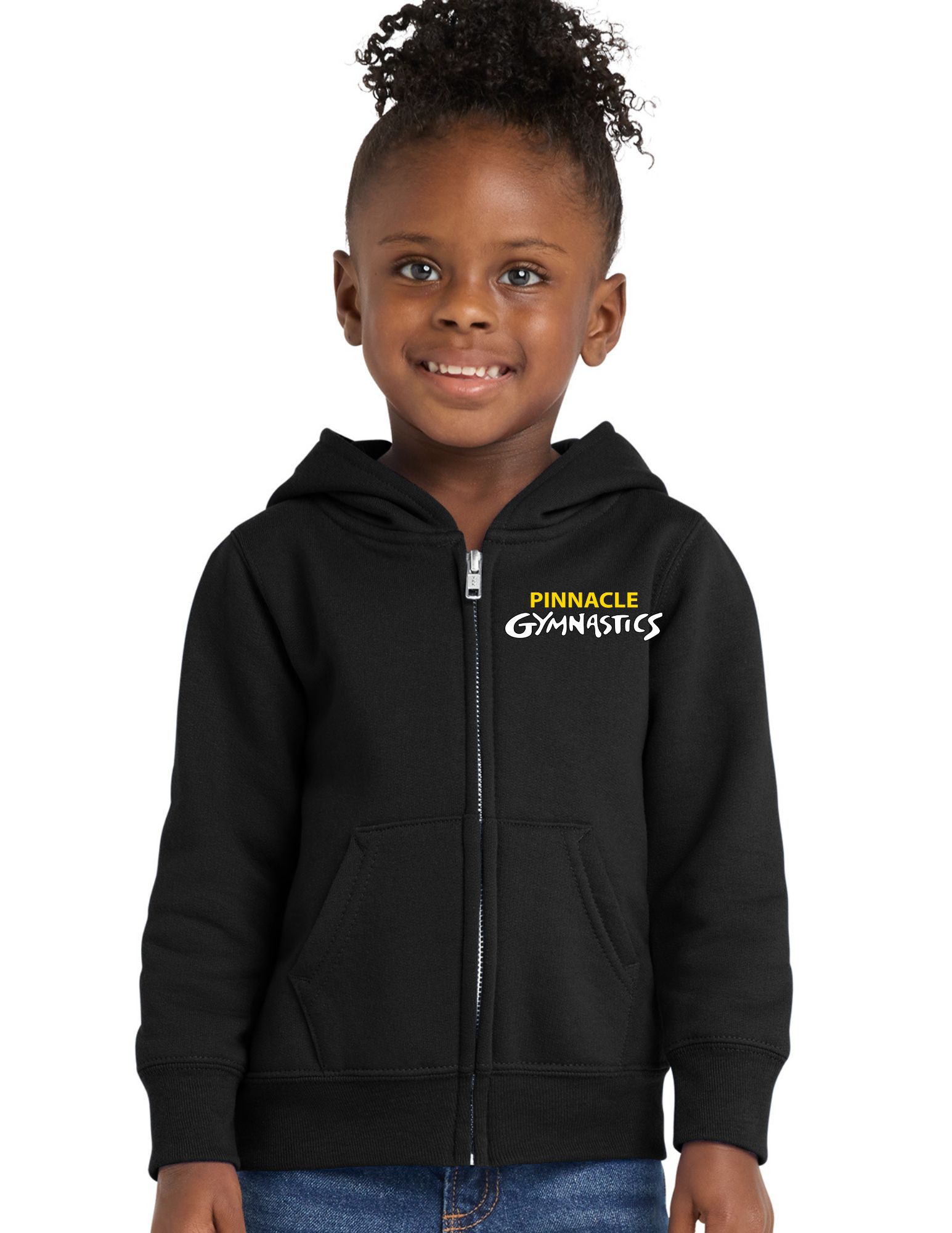 This toddler full-zip hooded sweatshirt comes decorated with the Traditional Pinnacle Gymnastics Script on the the left crest. Your choice of athletic heather or black in 2T, 3T, or 4T.